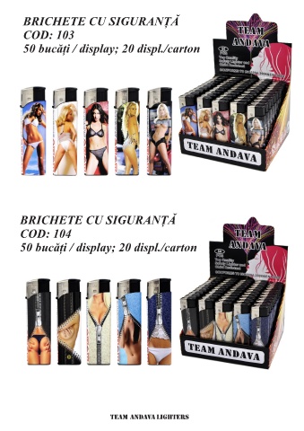 BRICHETE CU SIGURANȚĂ COD: 103 50 bucăți / display; 20 displ./carton BRICHETE CU SIGURANȚĂ COD: 104 50 bucăți / display; 20 displ./carton team andava lighters
