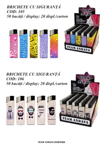 BRICHETE CU SIGURANȚĂ COD: 105 50 bucăți / display; 20 displ./carton BRICHETE CU SIGURANȚĂ COD: 106 50 bucăți / display; 20 displ./carton team andava lighters