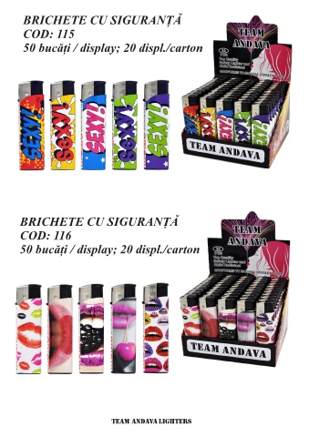 BRICHETE CU SIGURANȚĂ COD: 115 50 bucăți / display; 20 displ./carton BRICHETE CU SIGURANȚĂ COD: 116 50 bucăți / display; 20 displ./carton team andava lighters